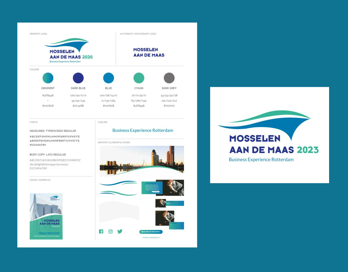 For the corporate identity of Mussels at the Meuse, we chose cyan and blue. With these colors, we wanted to emphasize the nautical character of the waterfront fair. Rotterdam is of course a port city, so this event fits in incredibly well! We also thought of this when designing the logo: the wavy shapes are reminiscent of water, but together the shapes also seem to represent a kind of ship.