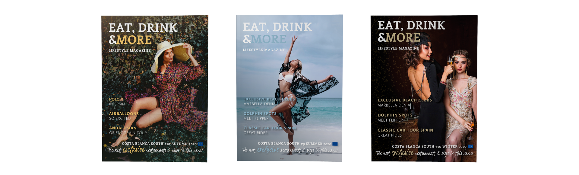 Eat, Drink & More magazine is een lifestyle magazine dat sinds 2017 vier keer per jaar seizoensgericht wordt uitgebracht in de Costa Blanca in Spanje. Het magazine bestaat vooral uit advertenties van lokale bedrijven (Costa Blanca) en soms ook van bedrijven uit Nederland. Ook zijn er elke editie een aantal redactionele stukken te lezen die gaan over lifestyle gerelateerde onderwerpen zoals reizen, horeca, fashion en beauty. Andere onderwerpen die in het magazine voorkomen zijn auto’s & motoren, bars & restaurants, business & Legal services, entertainment, gezondheid & beauty, reizen, real estate en winkels & retail.