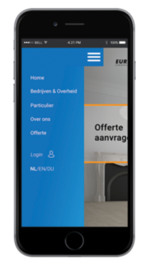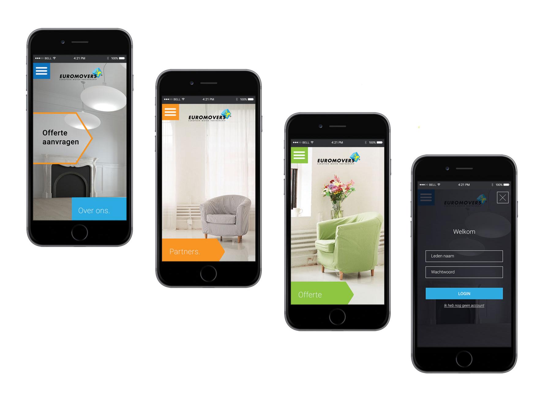 De volgende stap was voor onze User Interface (UI) designer. Hij heeft het interactie ontwerp gevisualiseerd. Op de afbeeldingen hierboven kun je zien hoe de nieuwe website er op een desktop uit ziet. Maar er zijn natuurlijk ook mensen die de website bezoeken via een mobiele telefoon of tablet. Met alle mogelijkheden en uiteenlopende merken van tegenwoordig heb je simpelweg heel veel verschillende maten van beeldschermen. Om te zorgen dat de website er op al die maten mooi uit ziet en goed functioneert, is de website volledig responsive ontworpen en ontwikkeld. Dat betekent dat de website mee schaalt op verschillende groottes, logisch te gebruiken is en aansluit op de behoeftes van de doelgroep van Euromovers.