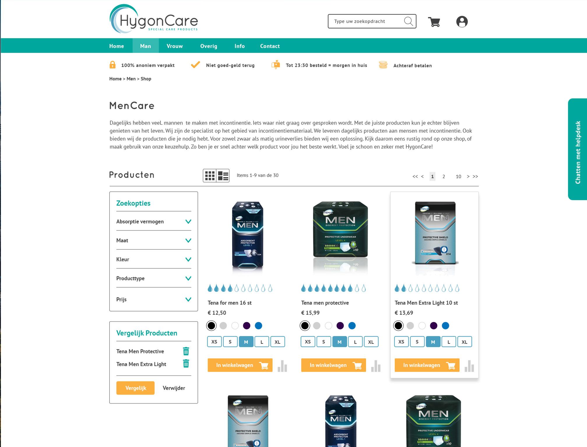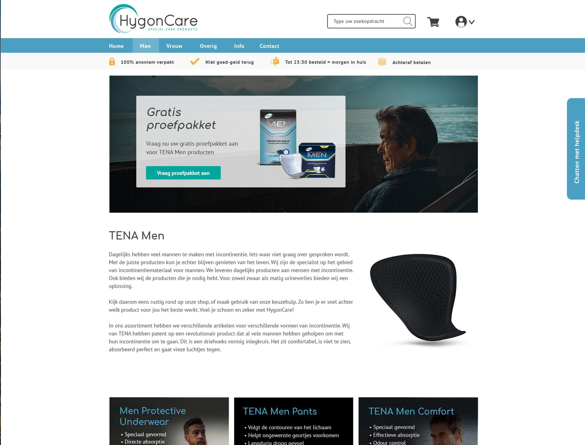 Er is zorgvuldig aan de slag gegaan! Voorop stond het feit dat incontinentie een gevoelig onderwerp is waar helaas een taboe op rust, ondanks dat het enorm veel voorkomt. Wij willen bijdragen aan het doorbreken van dit taboe en geloven dat informeren daarin een grote stap is. Alle content is dan ook op een informatieve en serieuze, maar ook heldere manier geschreven. Het is de bedoeling dat men de juiste pagina gemakkelijk kan vinden. Dat heeft niet alleen betrekking op het moment dat iemand op de website zit, maar begint eigenlijk al daarvoor. Met behulp van onze content marketeers hebben wij ervoor gezorgd dat alle informatie voldoet aan de SEO-eisen. Dit houdt in dat Hygoncare uiteindelijk bovenaan verschijnt in de zoekmachines, wat bijdraagt aan het snel vinden van de juiste informatie. Daarnaast wordt er gebruik gemaakt van SEA. Dit is zeer merkbaar in het verschijnen op Google Shopping. Ook daarmee verschijnen de juiste producten snel voor mensen die op zoek zijn naar incontinentie producten.