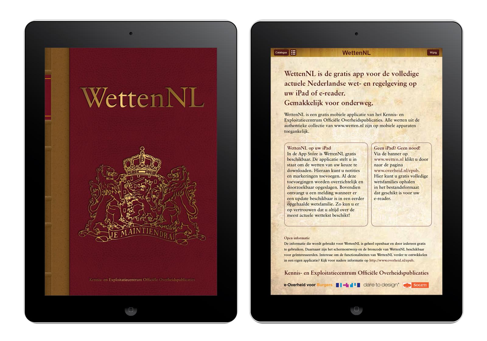 Voor KOOP (Kennis- en Exploitatiecentrum Officiële Overheidspublicaties) heeft The Dare Company het ontwerp gemaakt voor de iPad applicatie WettenNL. Hierop zijn alle Nederlandse Wetten te dowloaden en te bekijken. Deze app is sinds juni 2011 gratis te downloaden in de AppStore en nu al een groot succes! Binnen een week is de app al 15.000 keer gedownload.