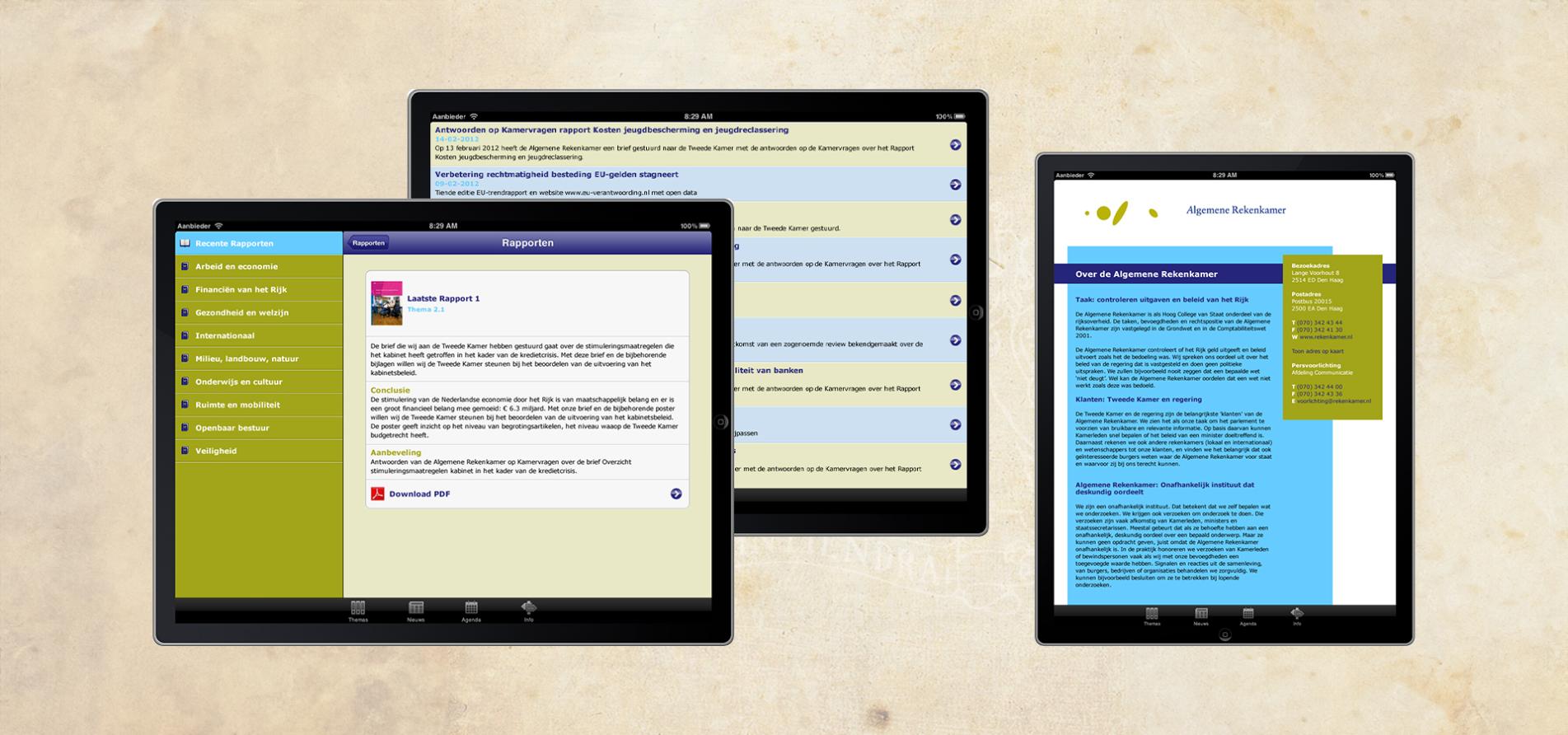 Voor Kennis- en Exploitatiecentrum Officiële Overheidspublicaties heeft The Dare Company het ontwerp gemaakt voor de iPad applicatie Rekenkamer. De Rekenkamer app stelt je in staat om de rapporten van de Algemene Rekenkamer te vinden en te downloaden op je iPad. Daarnaast vind je in de app de nieuwsberichten, de persberichten en publicatie-agenda van de Algemene Rekenkamer.