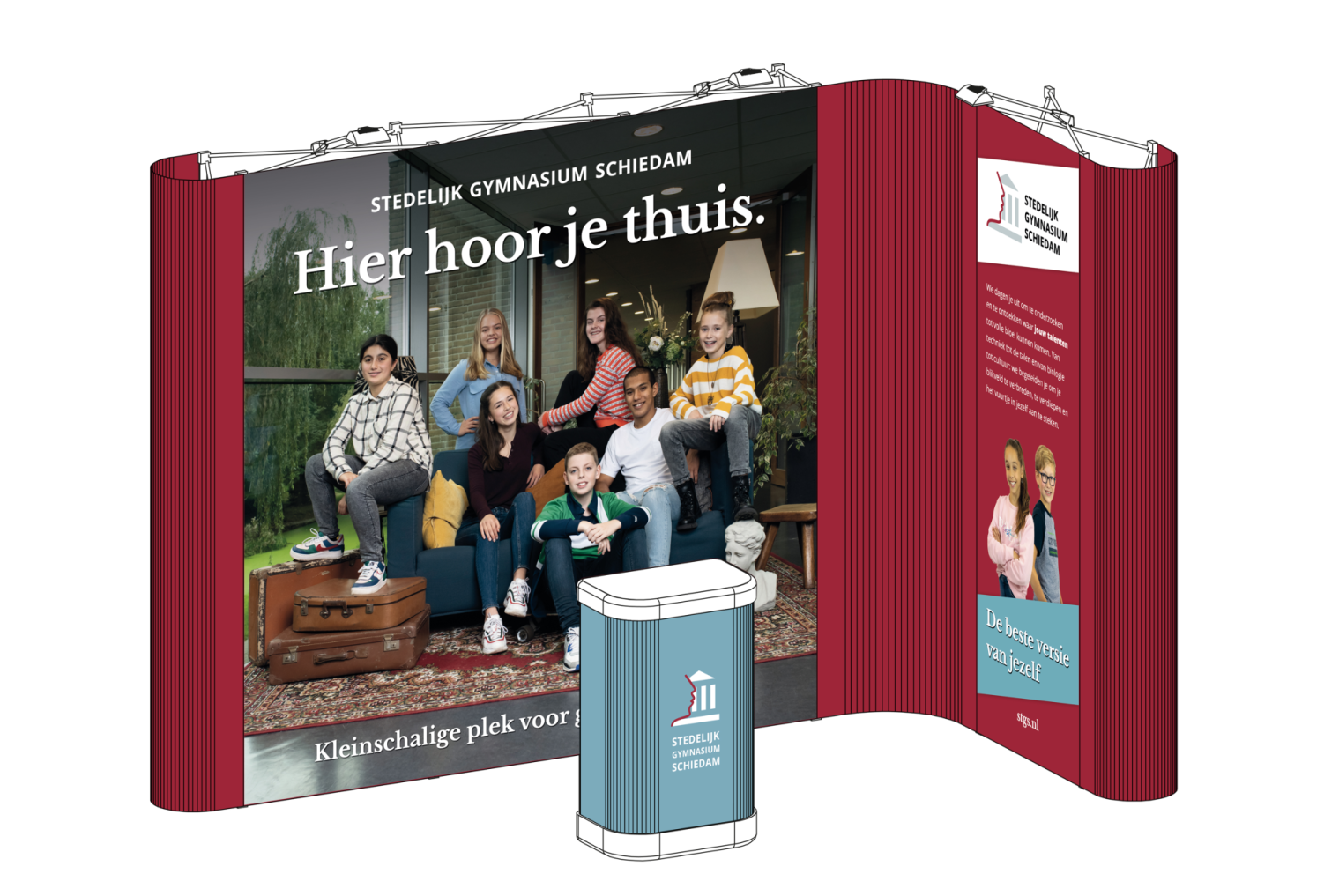 Ook de Beursstand is ontworpen aan de hand van de nieuw ontwikkelde huisstijl van The Dare Company. STGS was op zoek naar een nieuwe beursstand die goed laat zien wat voor school het STGS is. De beursstand wordt ingezet met opendagen, meeloopdagen en promodagen.
